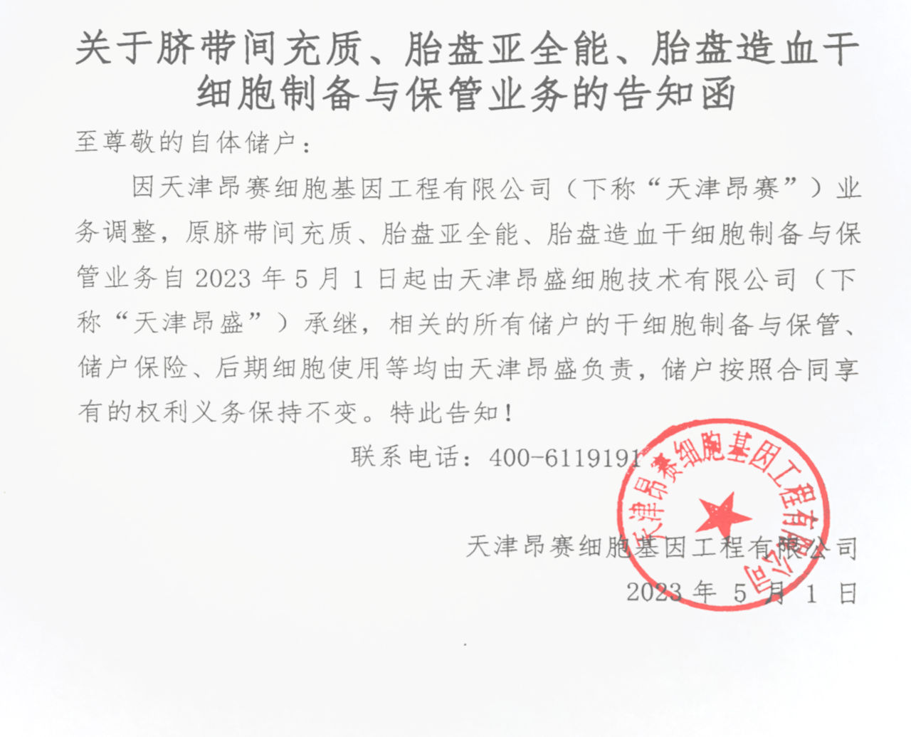 至尊敬的自体储户: 因米兰app官网下载(下称“天津昂赛”)业务调整,原脐带间充质、胎盘亚全能、胎盘造血干细胞制备与保管业务自2023年5月1日起由天津