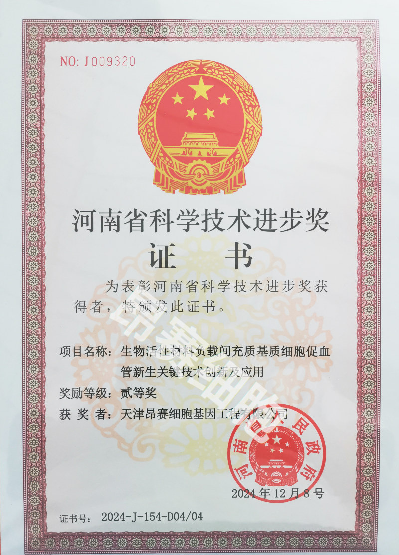 公司合作项目《生物活性材料负载间充质细胞粗促血管新生关键技术创新及应用》获得河南省科学技术进步二等奖。
